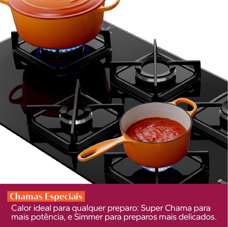 Desempenho e versatilidade em um único produto. As chamas especiais proporcionam o calor ideal para qualquer tipo de preparo, desde a Super Chama para potência e velocidade, até a Simmer, que oferece chamas mais baixas para preparos mais precisos e delicados.