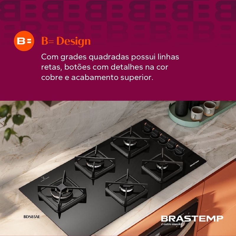 O exclusivo B= Design com grades quadradas de ferro fundido possui linhas retas, elegantes botões com detalhes cor cobre, mesa de vidro e acabamento superior. É o toque de modernidade que a sua cozinha pede e a Brastemp entrega.
