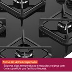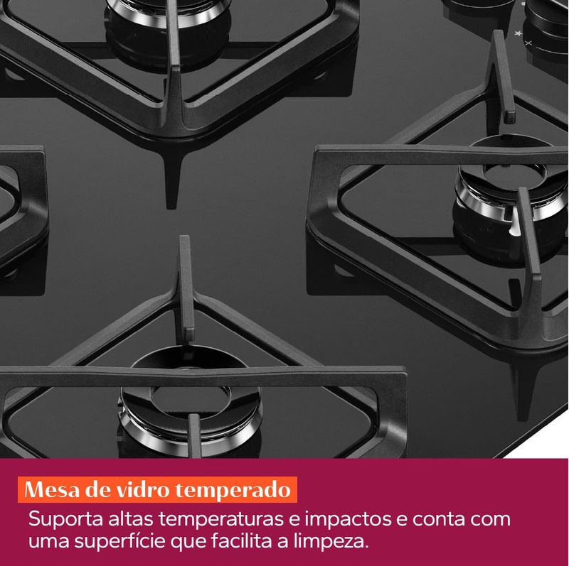 Resistência e segurança em um design sofisticado. A mesa de vidro temperado suporta altas temperaturas e impactos, enquanto a sua superfície facilita a limpeza.