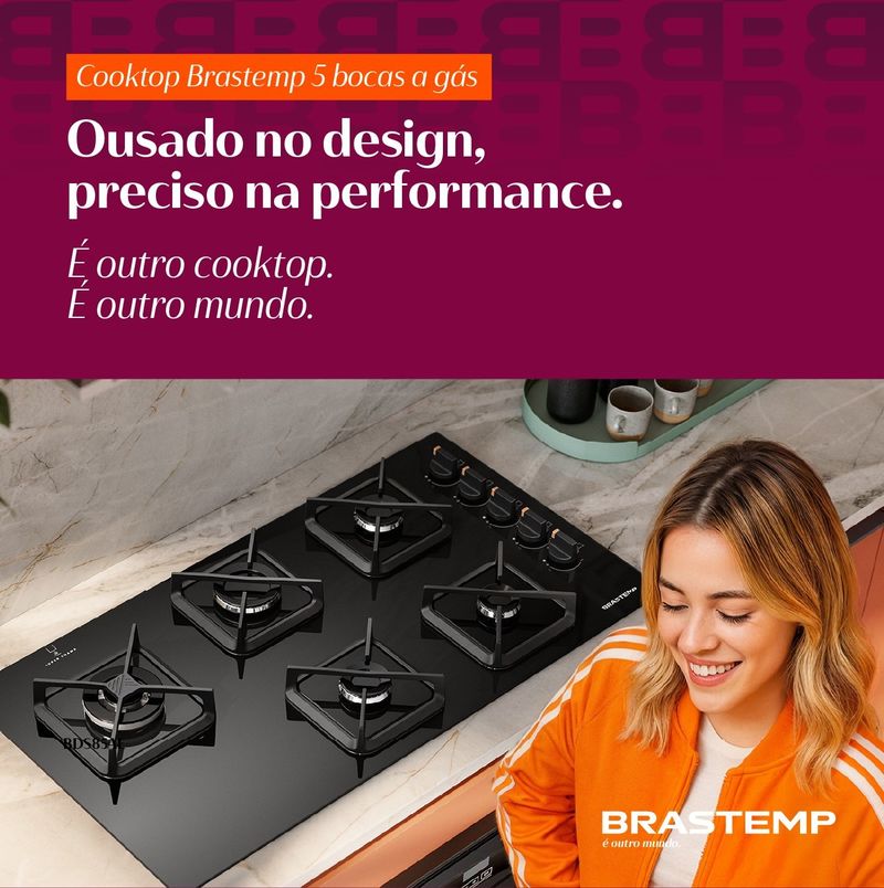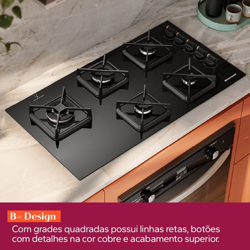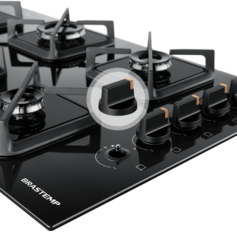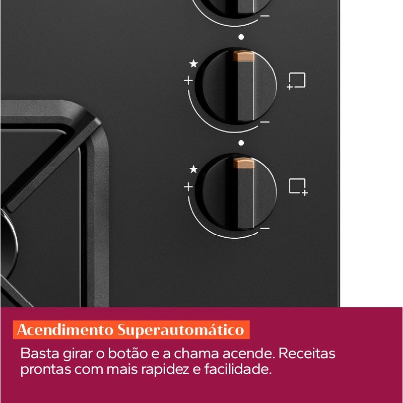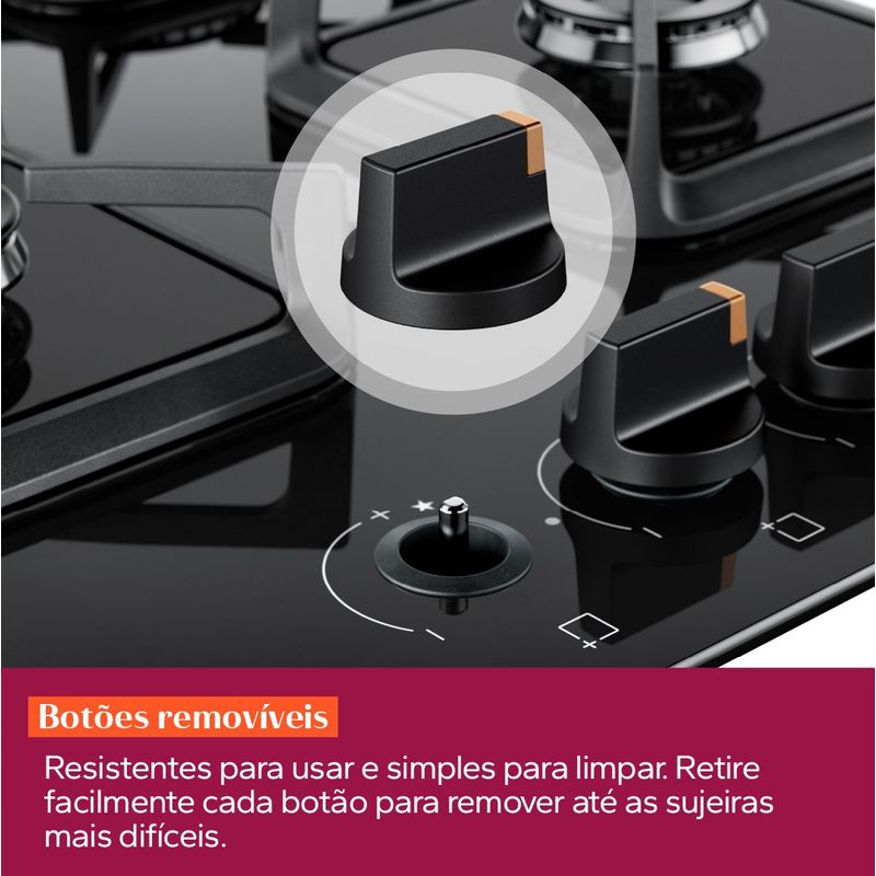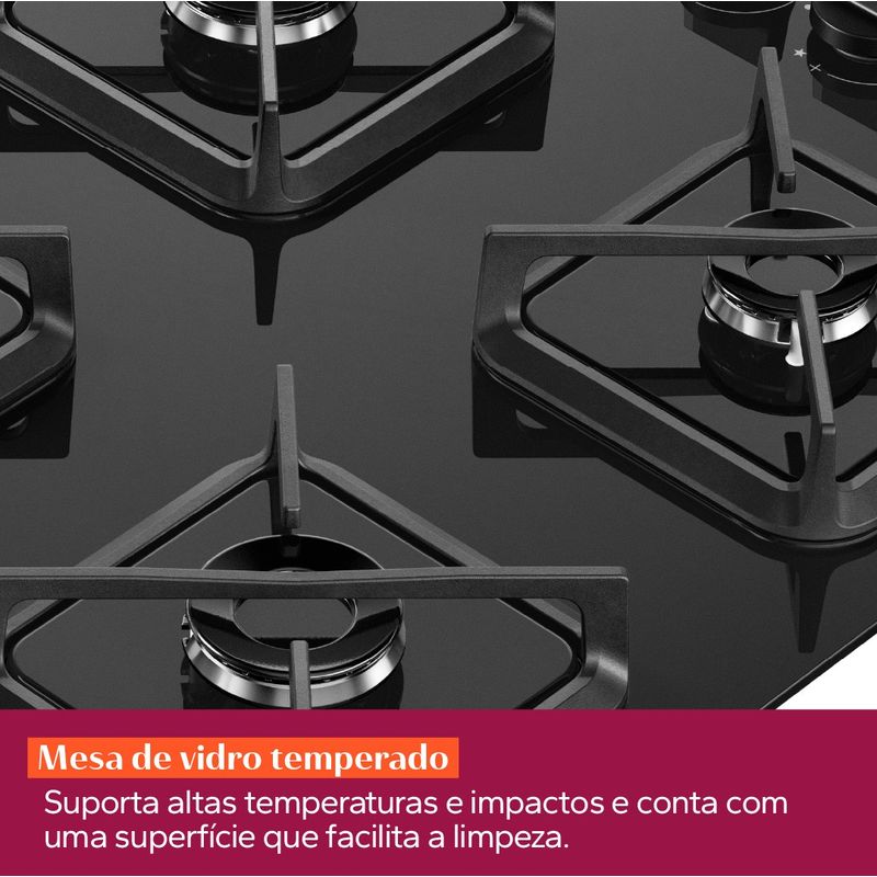 • Principais diferenciais: B=Design, Estabilidade com Grades de Ferro Fundido, Chamas Especiais, Mesa de Vidro Temperado, Botões Removíveis, Acendimento Superautomático
