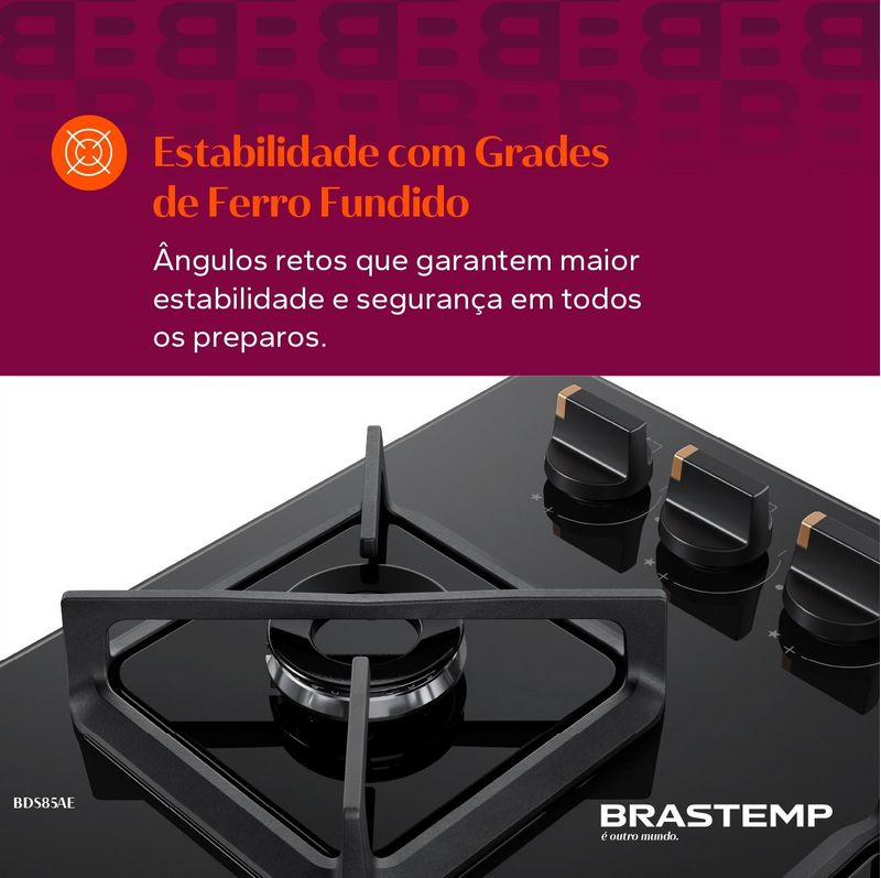 Estabilidade, robustez e durabilidade que só poderiam ser Brastemp. As grades de ferro fundido proporcionam performance superior através de ângulos retos, que garantem maior estabilidade e segurança em todos os preparos.