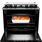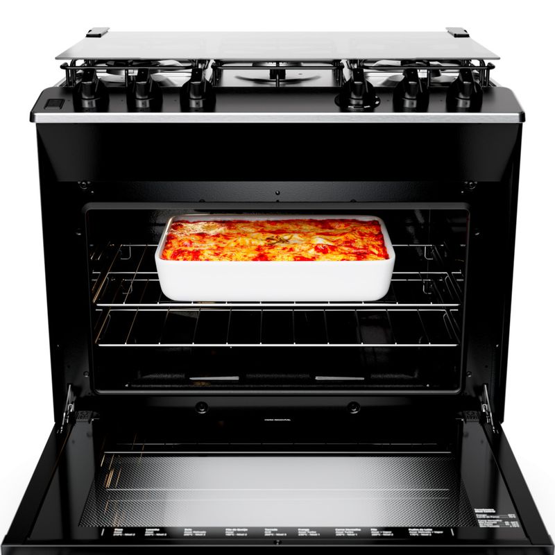 O forno tem 2 prateleiras com altura ajustável, o que facilita colocar fôrmas e travessas na melhor posição para cada um dos seus preparos.