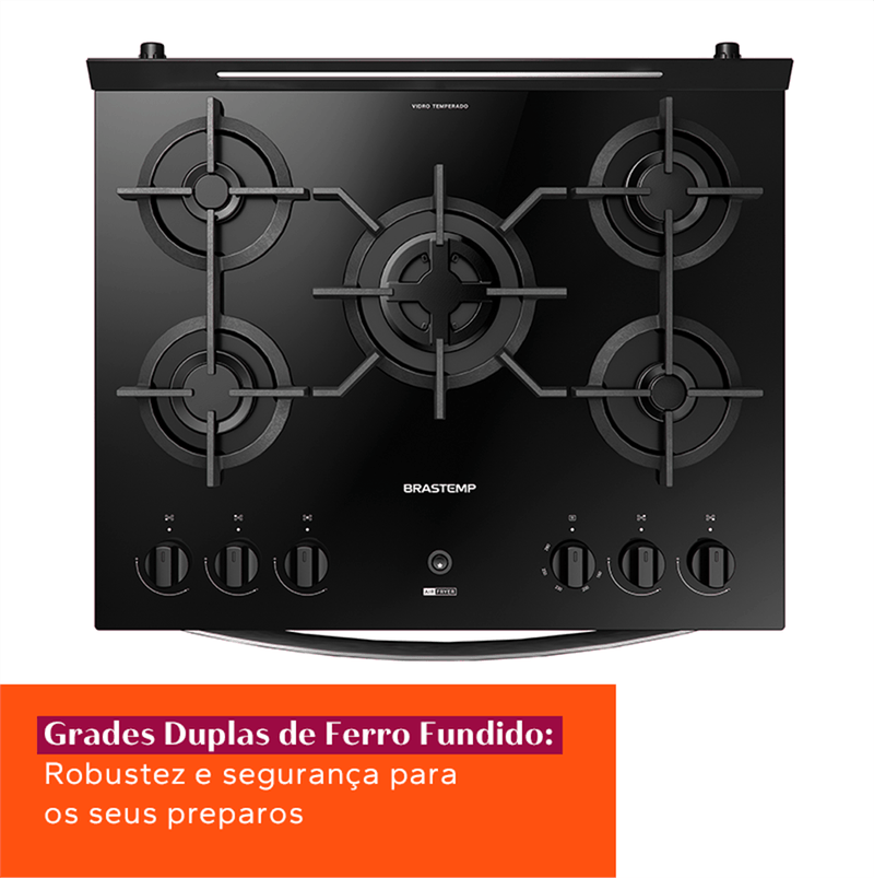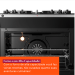 Com todos os revestimentos na cor preta, das laterais ao puxador do forno, até o vidro temperado.