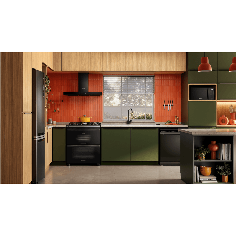 Um toque a mais de elegância e sofisticação para sua cozinha. Com revestimentos pretos em cada detalhe – das laterais ao puxador do forno e até o vidro temperado –, transforme a sua cozinha em um ambiente ainda mais moderno e cheio de estilo.