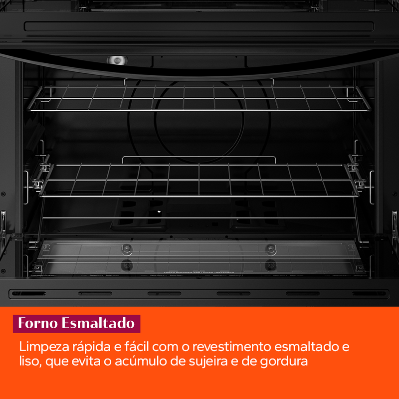 A limpeza fica ainda mais fácil com o revestimento interno liso, que evita o acúmulo de sujeira e de gordura nas paredes. Limpar é simples: basta um pano úmido com detergente neutro ou desengordurante, e o forno está pronto para o próximo uso.