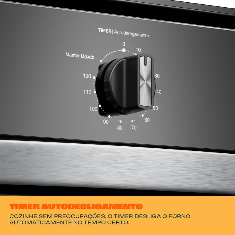 Quer preparar pratos no forno sem nenhuma preocupação? Com o timer, você cozinha com segurança e tranquilidade, sem precisar vigiar o relógio. Assim que o tempo selecionado no timer acaba, o forno desliga automaticamente. Simples assim!