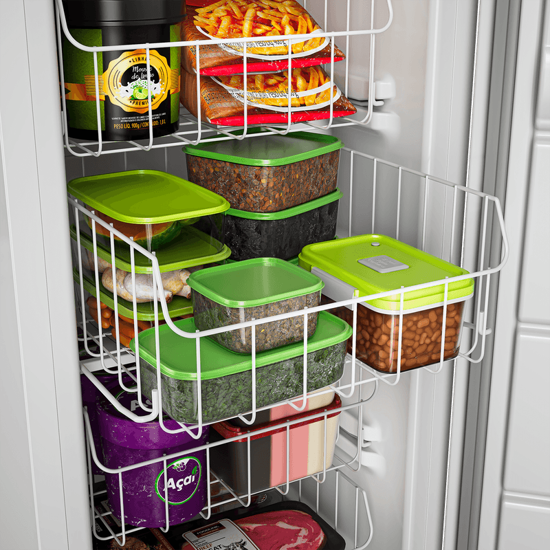 Os 4 cestos são deslizantes e removíveis, auxiliando na organização e acesso aos seus alimentos e bebidas, além de facilitar na hora da limpeza.