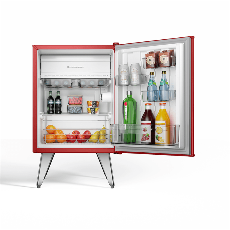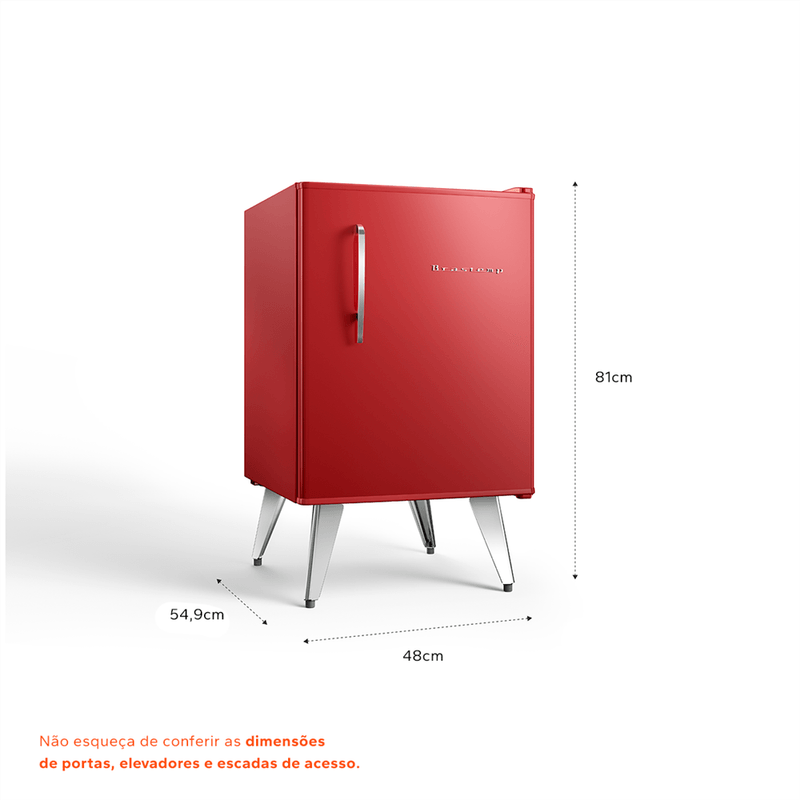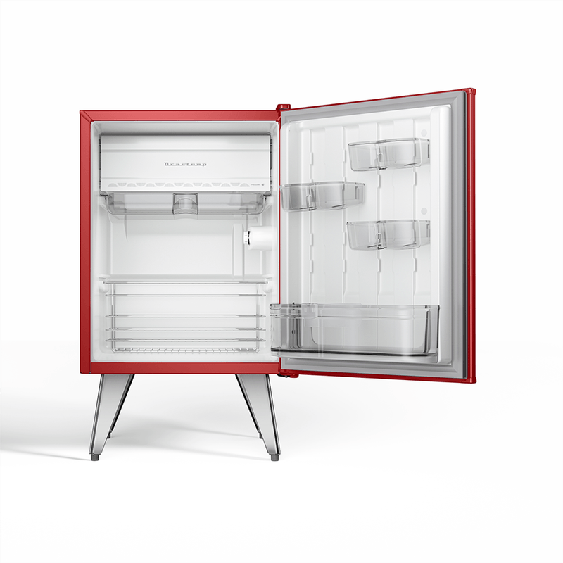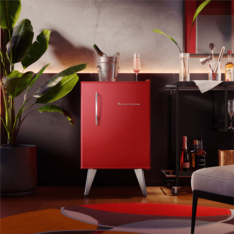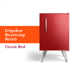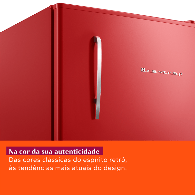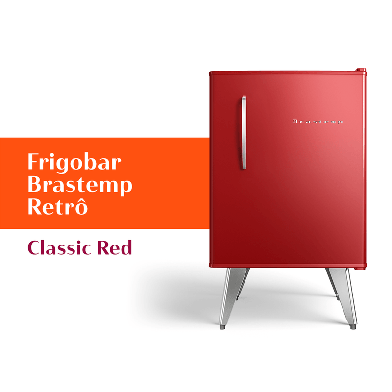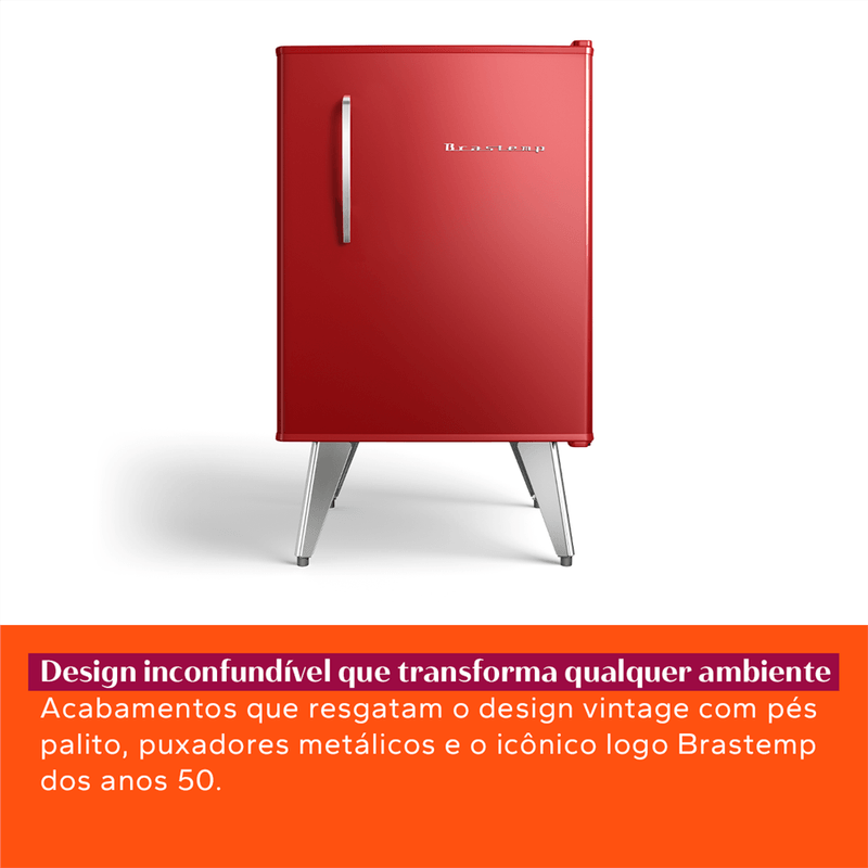 Onde chega, o Frigobar Brastemp Retrô se torna o destaque, deixando aquele canto da casa com ainda mais personalidade e transformando o seu mundo. Os acabamentos resgatam o design vintage com pés palito, puxadores metálicos e o icônico logo Brastemp dos anos 50.