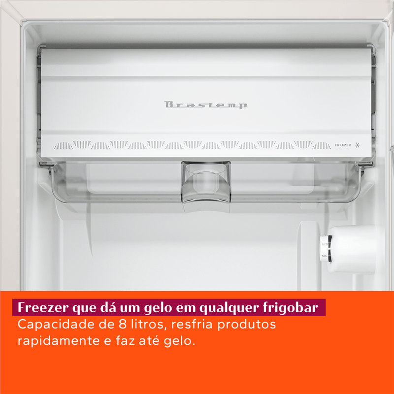 Quando o assunto é gelar, o freezer do Frigobar Brastemp Retrô vai muito além. Além da capacidade de 8 litros, ele consegue resfriar produtos rapidamente, gelar bebidas na hora, armazenar itens congelados e até fazer gelo. É outro mundo mesmo.