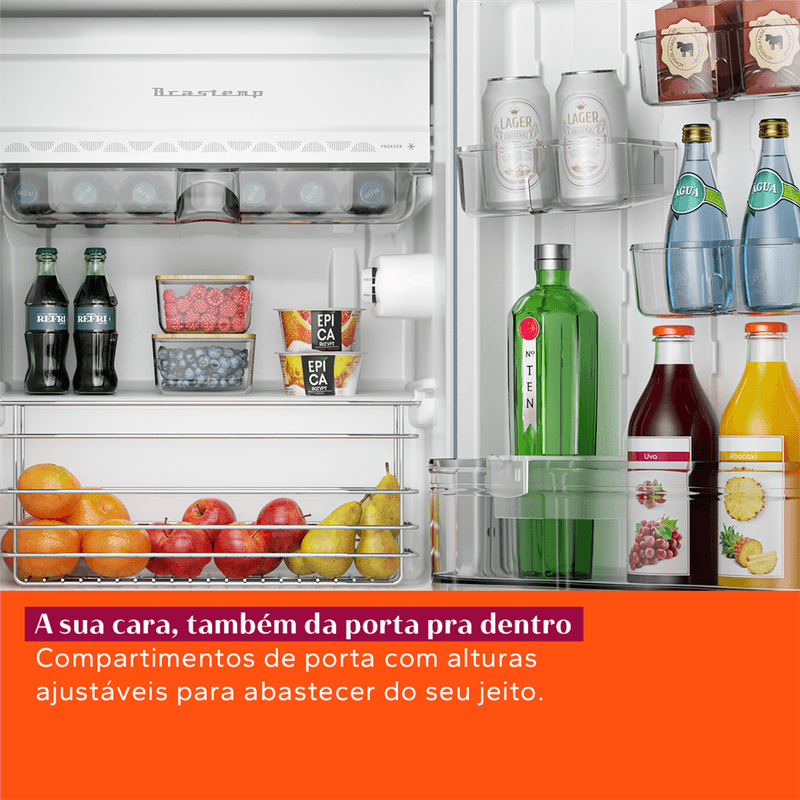 Surpreenda-se com a possibilidade de armazenar tudo como você quiser. Seja nos compartimentos modulares da porta com alturas ajustáveis, no freezer ou no cesto cromado, você tem um espaço todo seu para abastecer o Frigobar Brastemp Retrô do seu jeito.