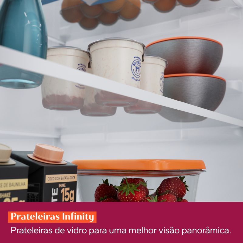 Mais liberdade e visibilidade para organizar tudo do seu jeito. As prateleiras de vidro temperado e borda infinita combinadas à iluminação em LED oferecem uma visão panorâmica e clara no interior da geladeira. Design feito para você ter tudo ao alcance dos seus olhos.