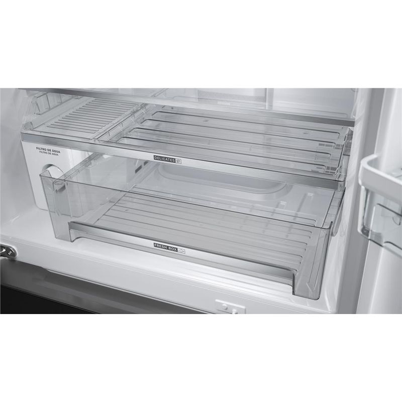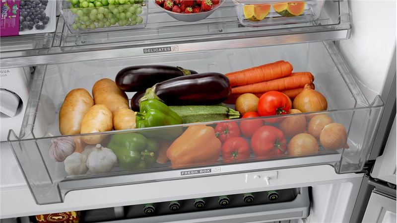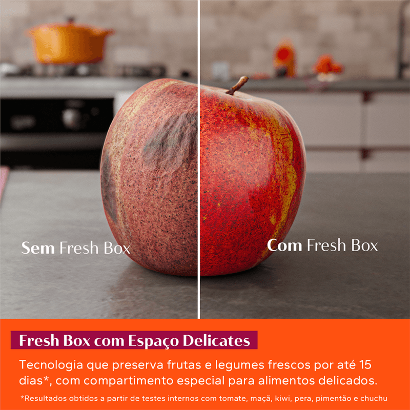 O frescor da caixa da feira para a sua geladeira! Tecnologia que preserva frutas e legumes frescos por até 15* dias, com Espaço Delicates para deixar alimentos delicados protegidos. *Resultados obtidos a partir de testes internos com tomate, maçã, kiwi, pera, pimentão e chuchu.