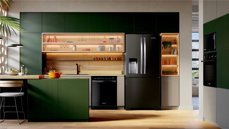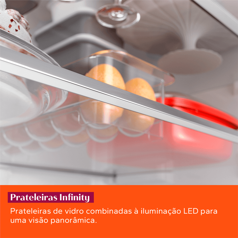 As prateleiras de vidro temperado e borda infinita combinadas à iluminação em LED oferecem uma visão panorâmica e clara no interior da geladeira. Design feito para você ter tudo ao alcance dos seus olhos.