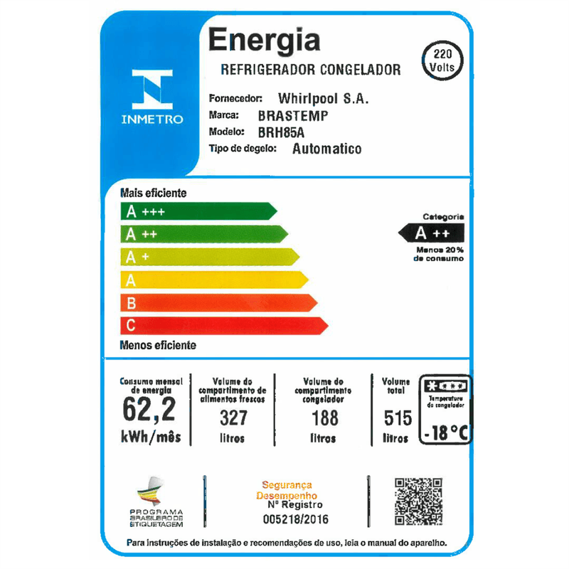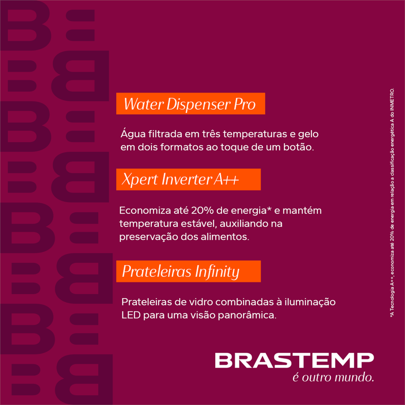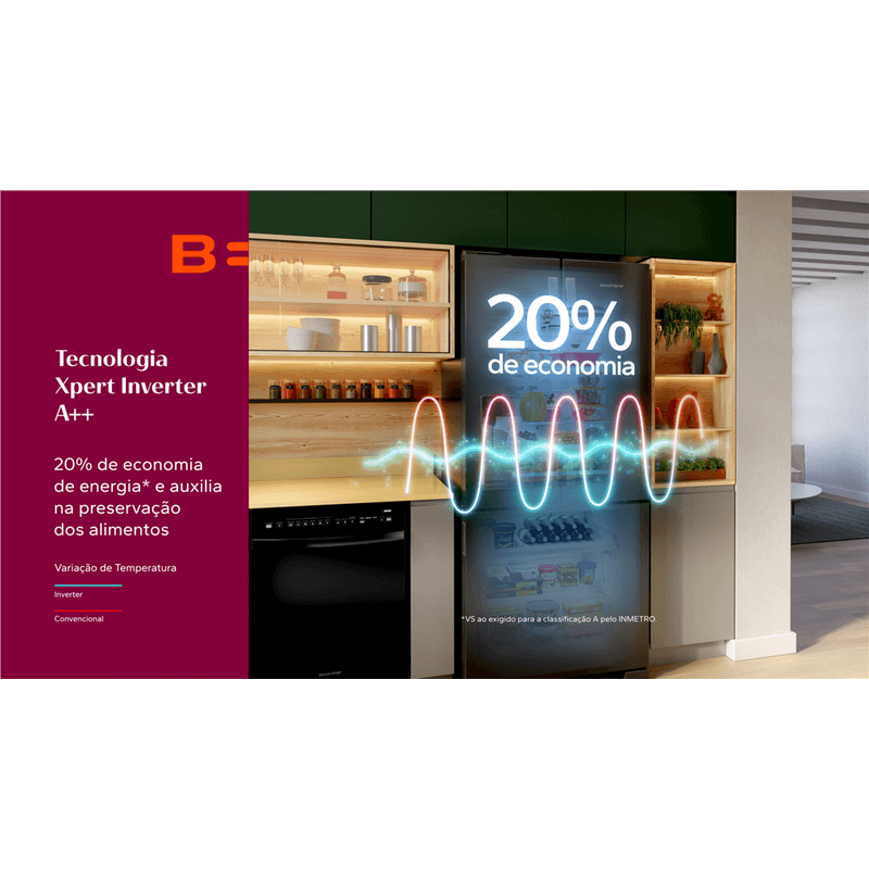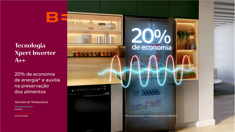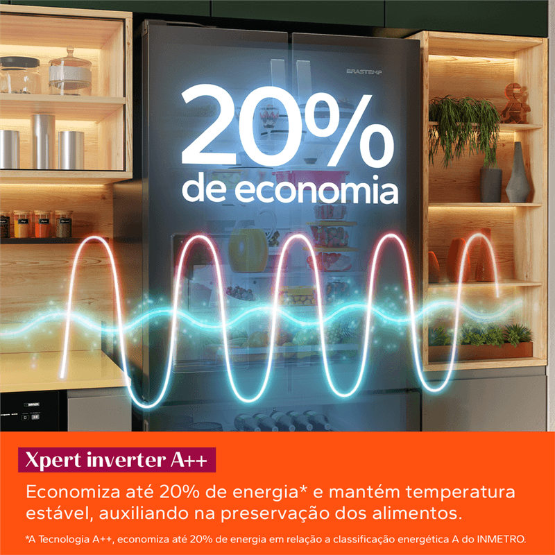 Tecnologia que economiza até 20%* de energia e garante a melhor performance e estabilidade de temperatura, auxiliando na preservação de alimentos. *A Tecnologia A++, economiza até 20% de energia em relação a classificação energética A do INMETRO.