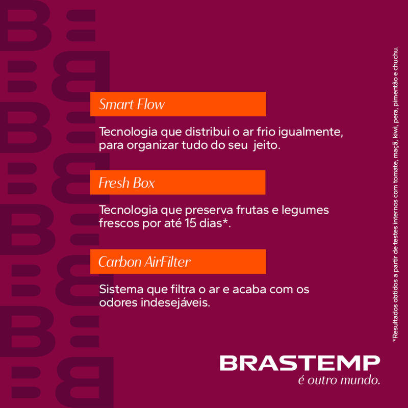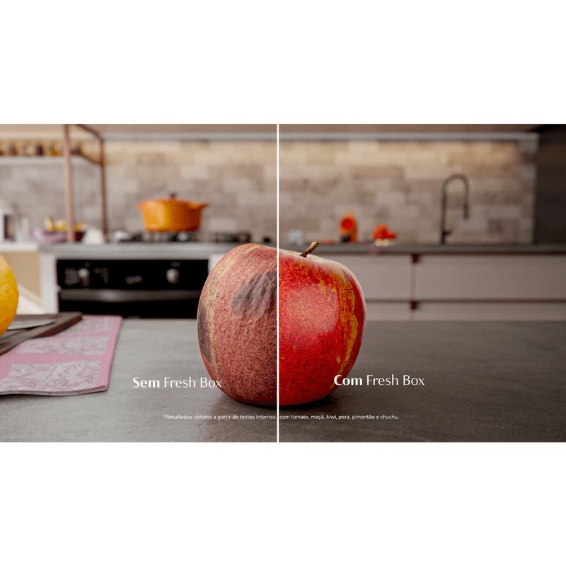 O frescor da caixa da feira para a sua geladeira! Tecnologia que preserva frutas e legumes frescos por até 15 dias*. *Resultados obtidos a partir de testes internos com tomate, maçã, kiwi, pera, pimentão e chuchu.