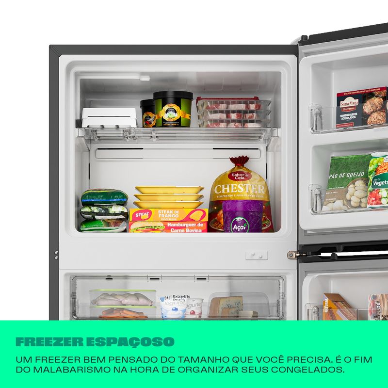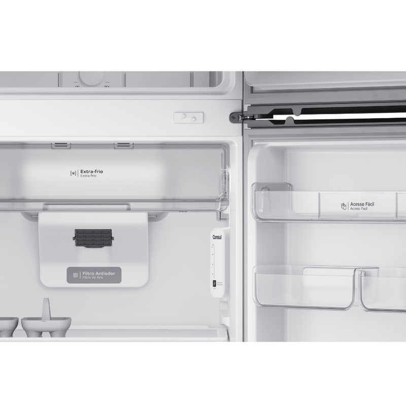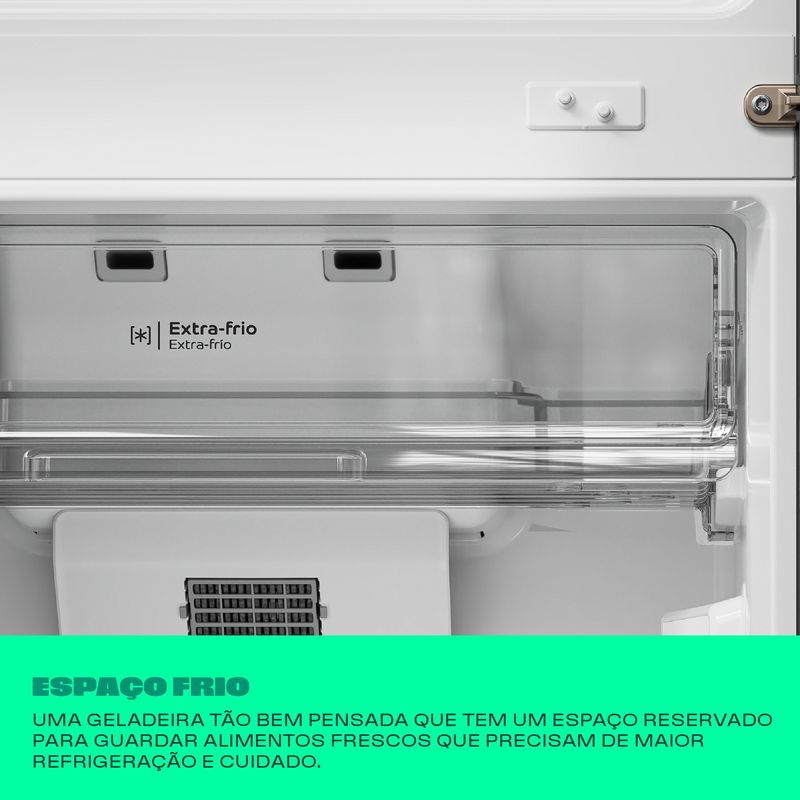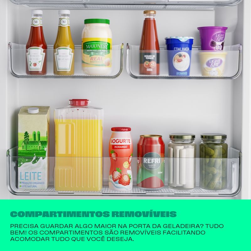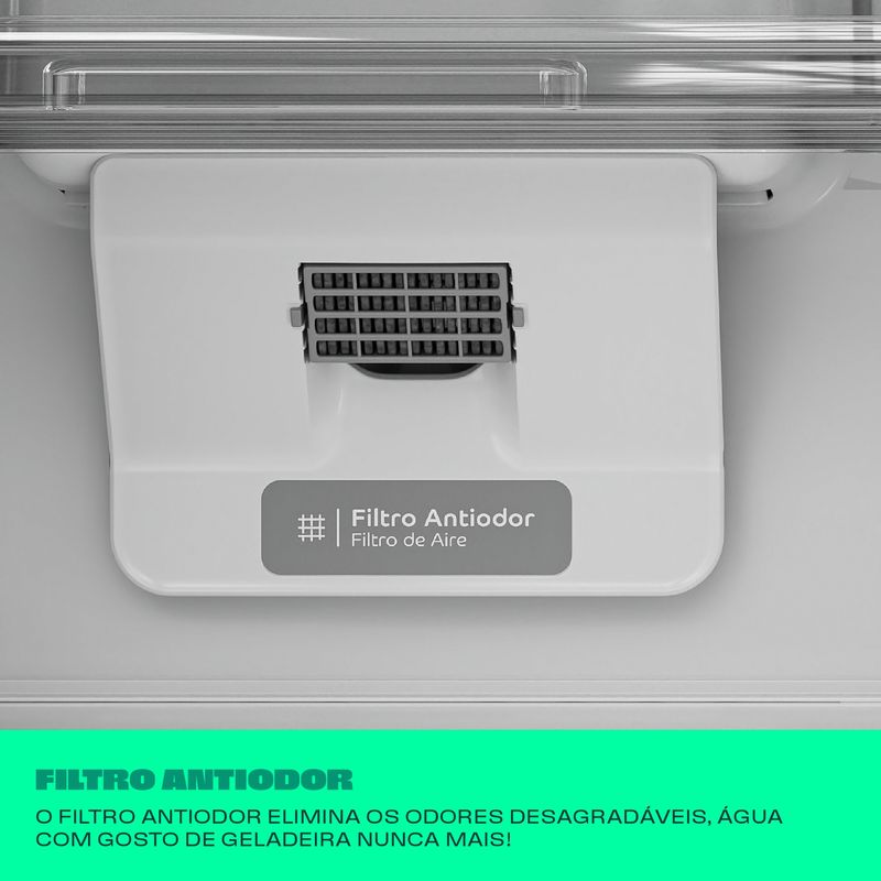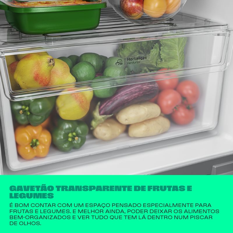 • Principais diferenciais: Compartimentos Removíveis, Freezer Espaçoso, Eficiência A+, Filtro Antiodor, Gavetão Transparente de Frutas e Legumes, Função Turbo