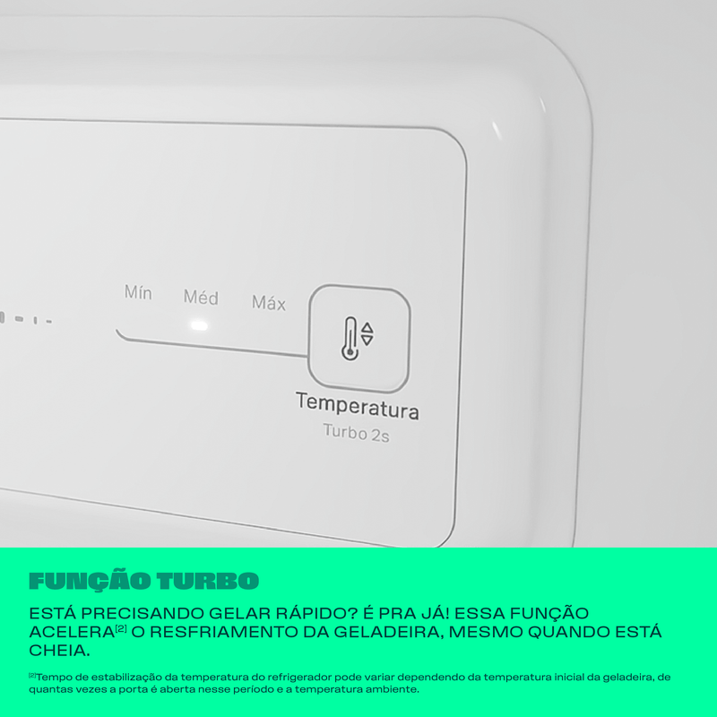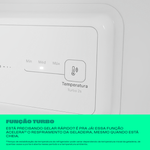 Está precisando gelar rápido? É pra já! Essa função acelera[] o resfriamento da geladeira, mesmo quando está cheia. *Tempo de estabilização da temperatura do refrigerador pode variar dependendo da temperatura inicial da geladeira, de quantas vezes a porta é aberta nesse período e a temperatura ambiente.