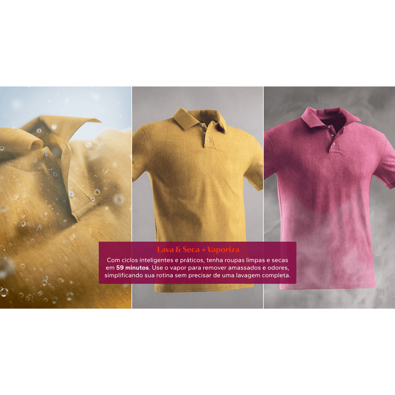 Suas roupas ficam limpas e secas em apenas 59 minutos. Com o Vaporizar, que utiliza vapor quente, evite longos ciclos de lavagem e elimine amassados¹ e odores² de forma fácil e eficiente. É praticidade que simplifica sua rotina.