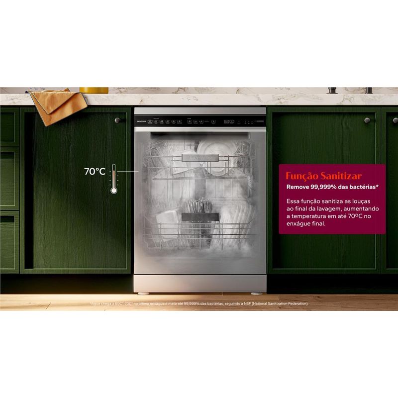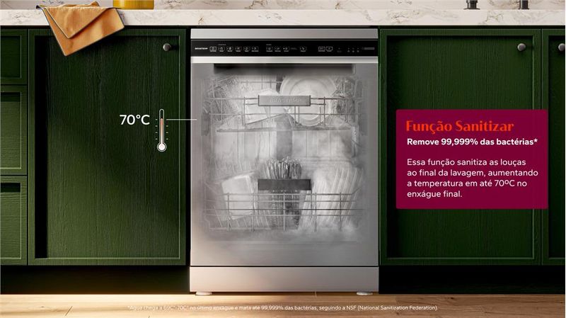 Remove 99,999% das bactérias4. Essa função sanitiza as louças ao final da lavagem, aumentando a temperatura em até 70ºC no enxágue final. Ideal para limpar e higienizar itens mais sensíveis como produtos de bebê, até louças, garrafas e outros.