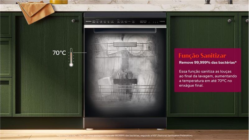 Remove 99,999% das bactérias4. Essa função sanitiza as louças ao final da lavagem, aumentando a temperatura em até 70ºC no enxágue final. Ideal para limpar e higienizar itens mais sensíveis como produtos de bebê, até louças, garrafas e outros.