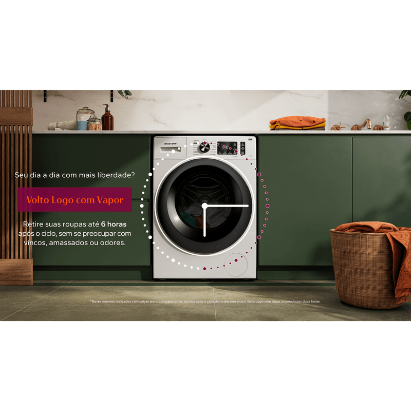 Tenha o poder do vapor a seu favor com 3 ciclos que facilitam sua rotina de lavagem. O ciclo Vaporizar desamassa e reduz odores sem precisar lavar; já o Lavar com Vapor entrega um resultado superior; e a função Volto Logo com Vapor permite deixar a roupa na máquina por mais tempo após o fim do ciclo sem risco de mau odor.