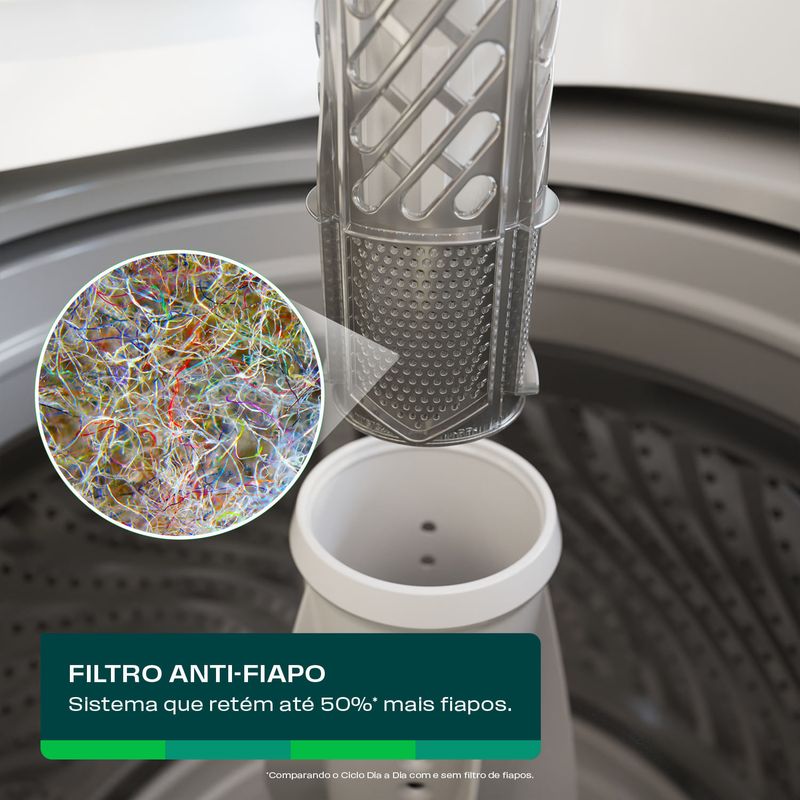 O novo sistema de filtragem da Consul retém até 50%[7] mais de fiapos, deixando a sua roupa com aparência renovada.