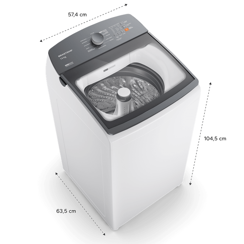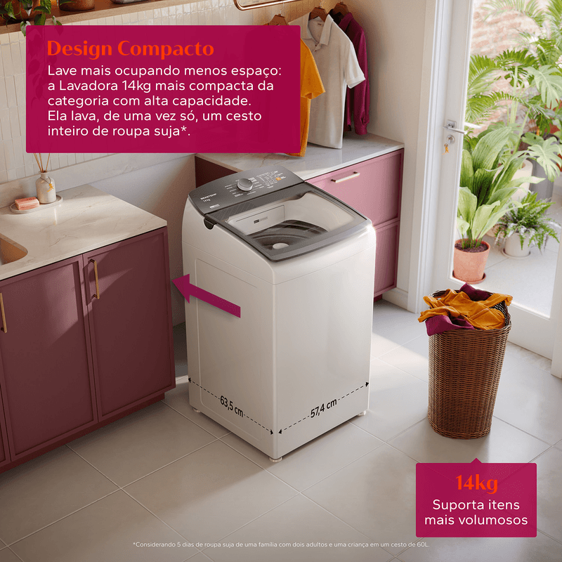 Lave mais ocupando menos espaço: a Lavadora 14kg mais compacta da categoria com alta capacidade. Ela lava, de uma vez só, um cesto inteiro de roupa suja² e não ocupa tanto espaço na sua casa. É o melhor dos dois mundos.