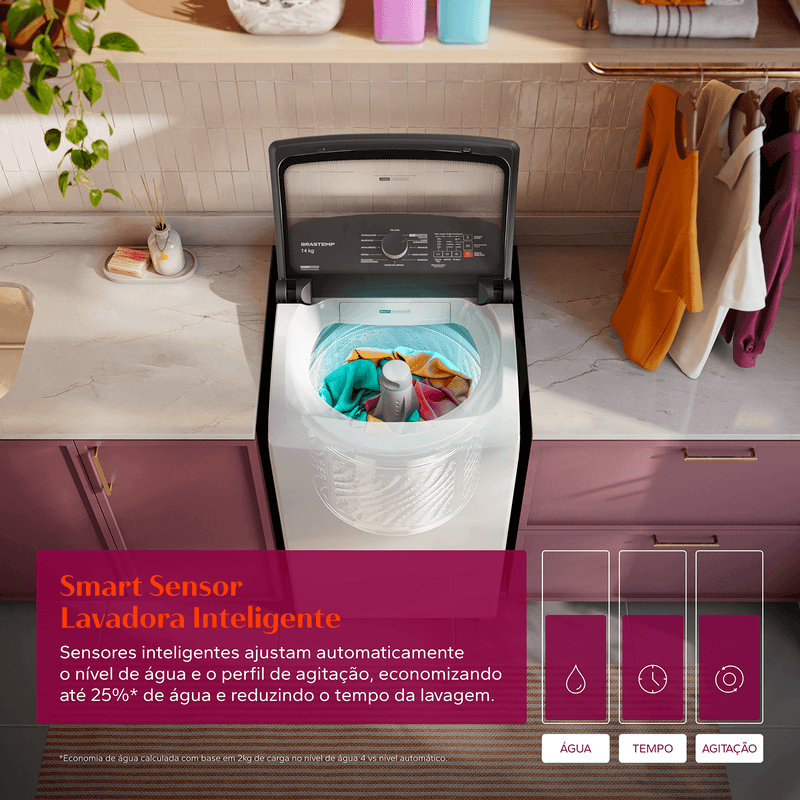A Lavadora que pensa e faz por você. Sensores inteligentes identificam o peso das roupas e garantem a performance ideal. Eles ajustam automaticamente o nível de água e o perfil de agitação, economizando até 25% de água¹ e reduzindo o tempo da lavagem. É o futuro dentro da sua casa.