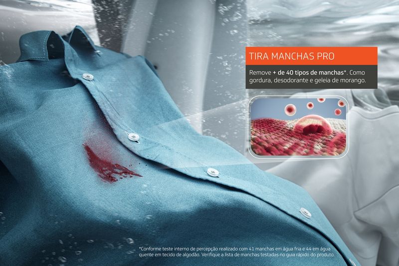 Com a ação da água quente, o Tira Manchas Pro oferece máxima performance de lavagem, que remove mais de 40 tipos de manchas[1], de gordura à molho de tomate.
