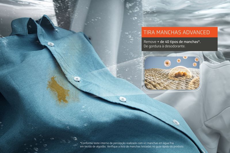 Ciclo com sistema exclusivo de molho e agitação, que remove totalmente mais de 40 tipos de manchas[1] difíceis, sejam elas de canetinha, desodorante[2], ou até mesmo aquelas que já estão secas faz tempo.