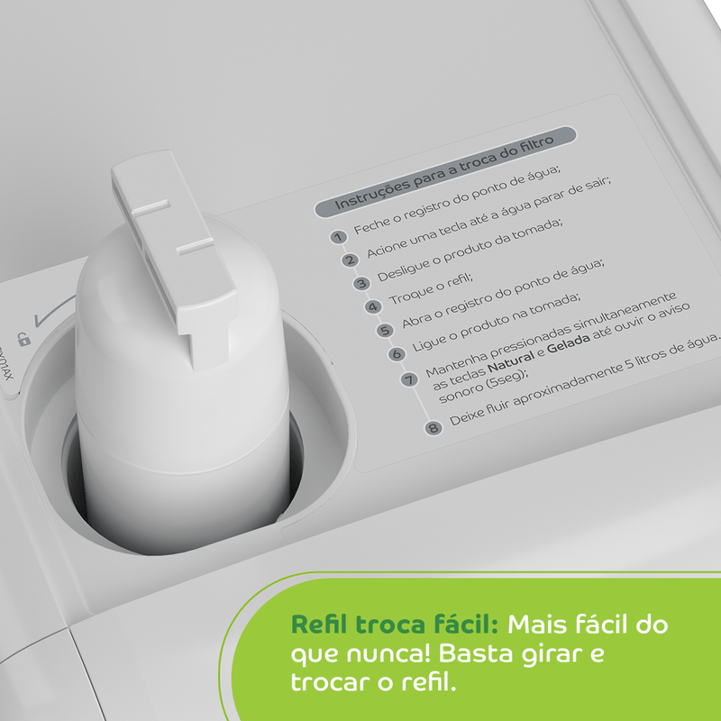 Principais diferenciaisAlta Capacidade de Refrigeração, 3 Níveis de Temperatura, Indicador de Vida Útil do Refil, Proteção Antibactérias, Refil Troca Fácil,