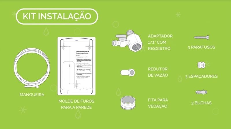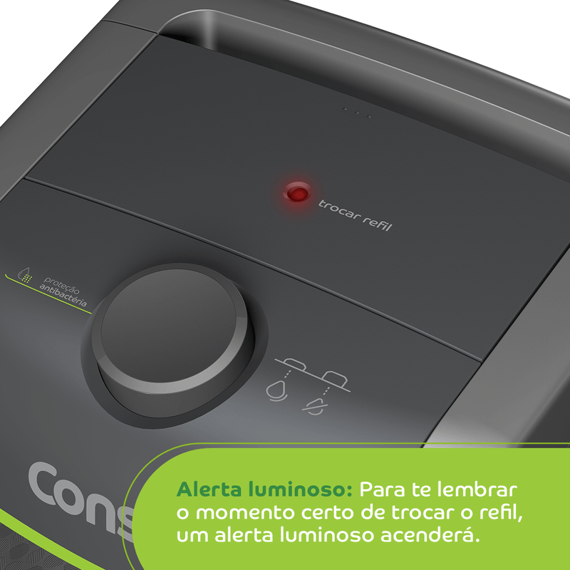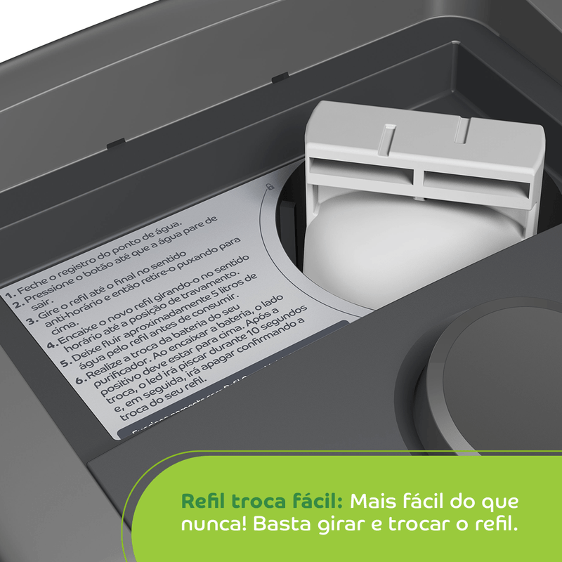 • Principais diferenciais: Filtragem classe A, Compacto, Refil troca fácil, Alerta luminoso de troca de refil, Eficiência bacteriológica, Kit Instalação
