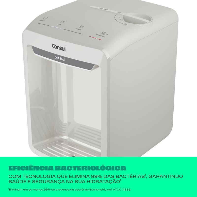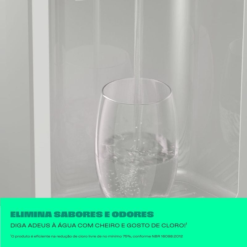 Redução de até 99% das bactérias, como por exemplo a E.Coli, que causa doenças gastrointestinais, garantindo mais saúde para sua família. Disclaimer: Redução de até 99% da bactéria E.Coli no final da vida útil do produto. Baseado no teste realizado com bactéria E. Coli.