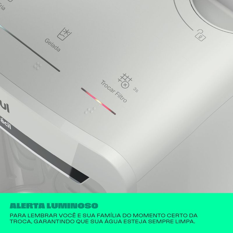 Pensando em garantir uma água sempre limpa, um alerta luminoso acenderá para te lembrar o momento certo de trocar o refil para você continuar bebendo água de qualidade.