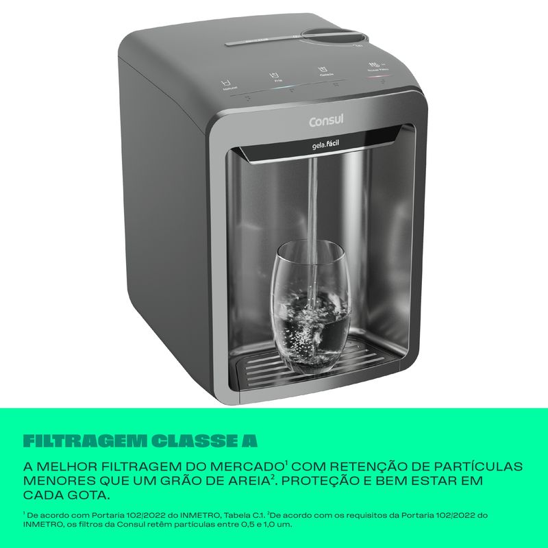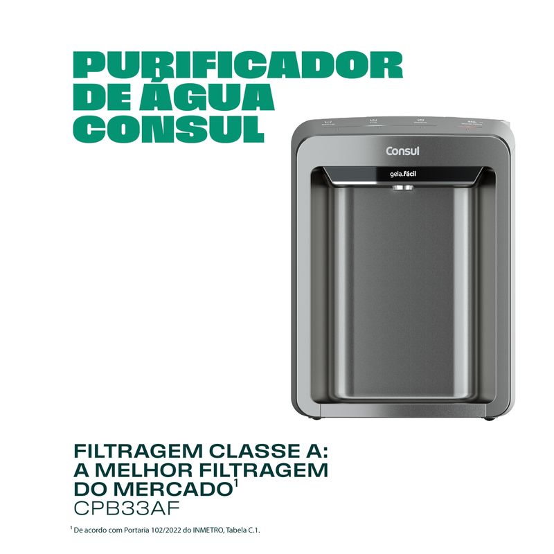 O CPB33AF vem com o refil original Consul que possui filtragem classe A, considerada a melhor filtragem do mercado pelo INMETRO. Retém partículas até 60x menores que um grão de areia. Disclaimer: De acordo com o INMETRO, o refil Consul garante filtragem classe A (retendo partículas entre 0,5 e 1 µm), retendo assim partículas menores que um grão de areia (62µm a 200µm).