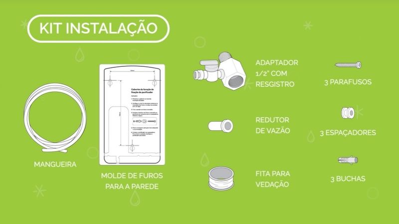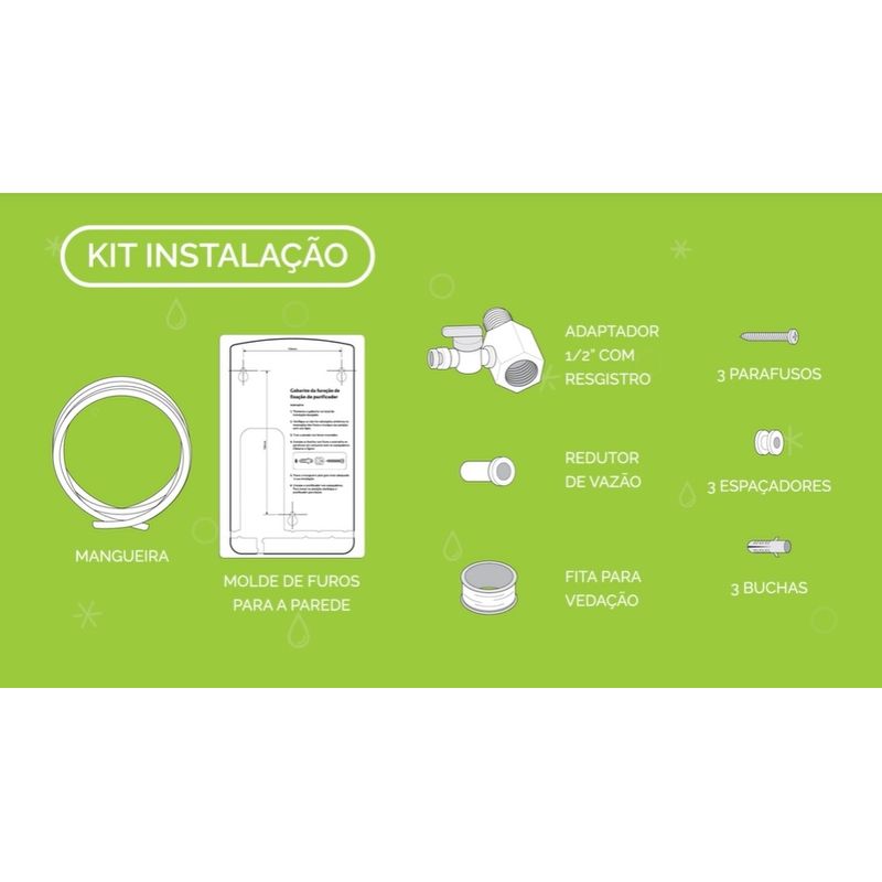 "O kit instalação vem para simplificar a sua vida. Além de poder instalar os purificadores na parede ou na bancada, ele vem com: 1 - mangueira 1,5m; 1 - model para furos na parede; 1 - adaptador 1/2"" com registro; 1 - rolo fita vedação; 1 - redutor de vazão; 3 - parafusos; 3 - espaçadores; 3 - buchas"