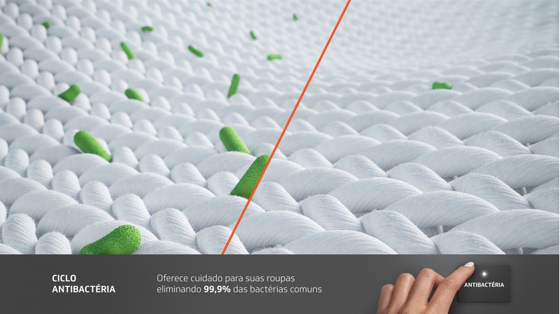 Elimina até 99,9%[3] das bactérias, colaborando com a saúde de sua família e higienização de suas roupas.